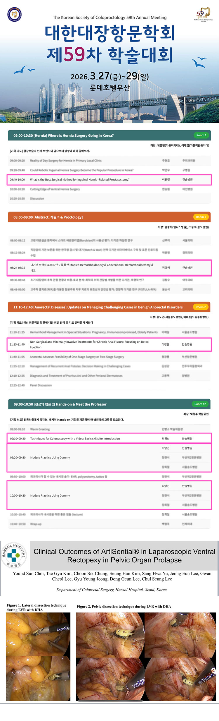 대장항문외과 이철승 부원장 / 최영선 진료과장 [포스터 발표] · Clinical Outcomes of ArtiSential® in Laparoscopic Ventral Rectopexy in Pelvic Organ Prolapse 대장항문외과 정규영 진료부원장 [Abstract_개원의 & Proctology] · 다기관 후향적 코호트 연구를 통한 Stapled Hemorrhoidopexy와 Conventional Hemorrhoidectomy의 비교 대장항문외과 이정은 진료부장 [Anorectal Diseases] Updates on Managing Challenging Cases in Benign Anorectal Disorders · Non-Surgical and Minimally Invasive Treatments for Chronic Anal Fissure: Focusing on Botox Injection 대장항문외과 이관철 진료부장 [Hernia] Where is Hernia Surgery Going in Korea? · What is the Best Surgical Method for Inguinal Hernia–Related Prostatectomy? 대장항문외과 최영선 진료과장 전공의 캠프 Hands-on & Meet the Professor · Techniques for Colonoscopy with a Video: Basic skills for introduction · Module Practice Using Dummy 한솔병원은 앞으로도 안주하지 않고 끊임없는 연구를 통해 앞선 기술로 더 큰 사랑을 실천할 것을 약속드립니다. 감사합니다. |